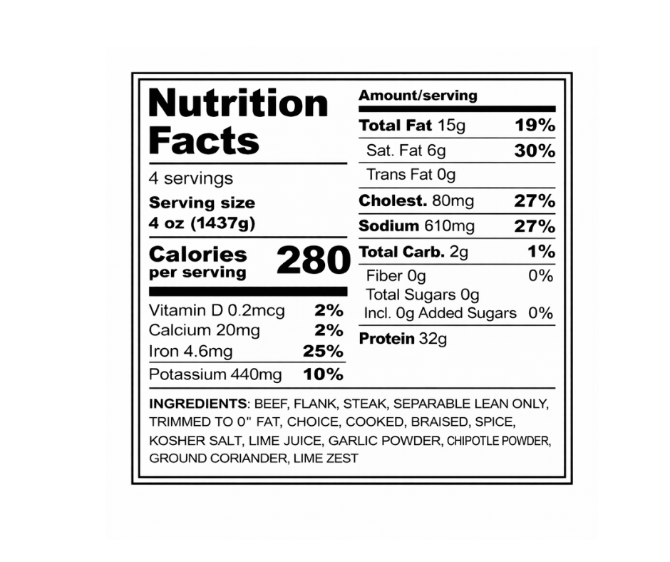 Grass-fed flank steak expertly seasoned and pre-cooked to bring classic carne asada flavor straight to your plate.